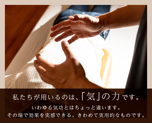 気持ちいいだけのマッサージはいたしません。骨バキバキもいたしません。気の施術といっても、邪気や霊障といった概念はいっさい持ち込みません。ひたすら効果を実感していただくことにこだわります。