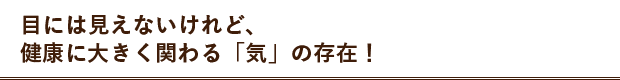 例えば重力は、目には見えなくても確かに存在します。人間の身体で言えば、血液の流れ・量・質など普段は意識できませんが、いずれも悪くなると体調に影響します。「気」も同様です。
