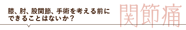 階段の上り下りがつらい! 季節の変わり目に疼く!変形性膝関節炎、膝の半月板損傷、ヒジの痛み、股関節の歪み、毎日の行動範囲を狭めてしまう深刻なお悩みですね。重症の場合は、もちろん整形外科での診察によって「人工関節」などの手術が必要になるケースもあります。