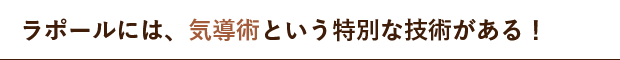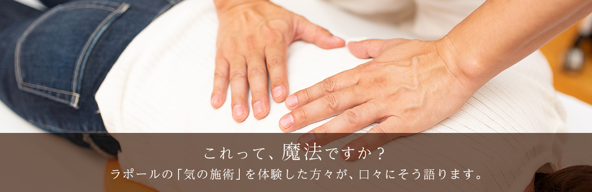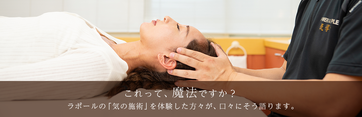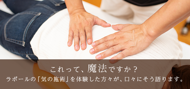 「気の施術」というと、もしかしたらちょっと怪しい!? と思われるかもしれませんが、どうぞご安心ください。ラポールの施術には「邪気」や「霊障」などの概念は一切持ち込まれません。「気の世界」は、ちょっと曖昧なイメージを持たれがちですが、むしろ結果と即効性にこだわるきわめて現実的なものです。
